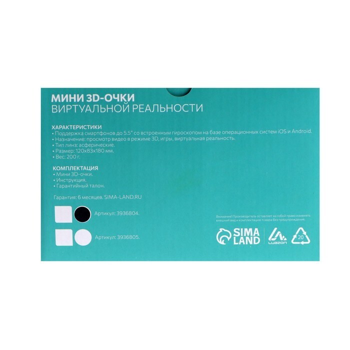 3D-очки LuazON - самое настоящее окно в волшебный мир виртуальной реальности. Принцип действия этой модели заключается в создании зрительного и акустического эффекта присутствия пользователя в локации, отображаемой на экране портативного устройства. Очки совместимы с любыми моделями смартфонов, чья диагональ экрана не более 5.5 дюймов. Удобные мягкие вставки в районе переносицы обеспечат комфортное погружение в волшебный 3D-мир по ту сторону экрана смартфона