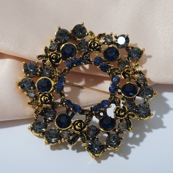 Брошь "Императрица" круг с розами, цвет серо-синий в чернёном золоте