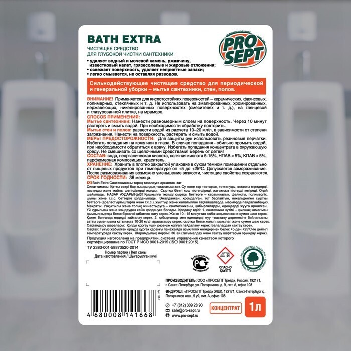 Сильнокислотное чистящее гелеобразное средство Bath Extra удаляет неприятные запахи и стойкие загрязнения: ржавчину, окалину, копоть, серу, известковый налёт, водный, мочевой, котловой камень, цемент, бетон, клей для бетона, строительную замазку, масло, жир. Обладает бактерицидным действием.