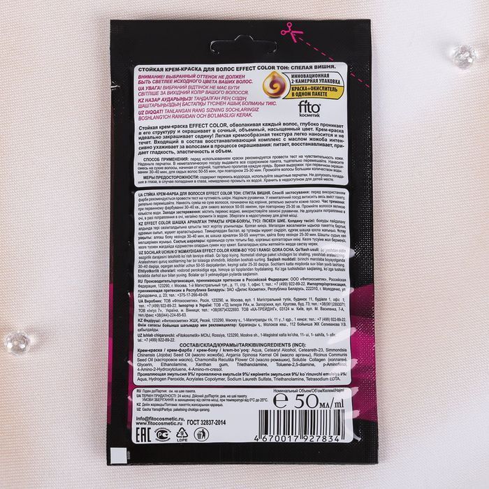Инновационная двухкамерная упаковка содержит краску и проявляющую эмульсию в одном пакете. Это стойкая крем-краска для волос после применения которой не требуется использование бальзама-ополаскивателя.