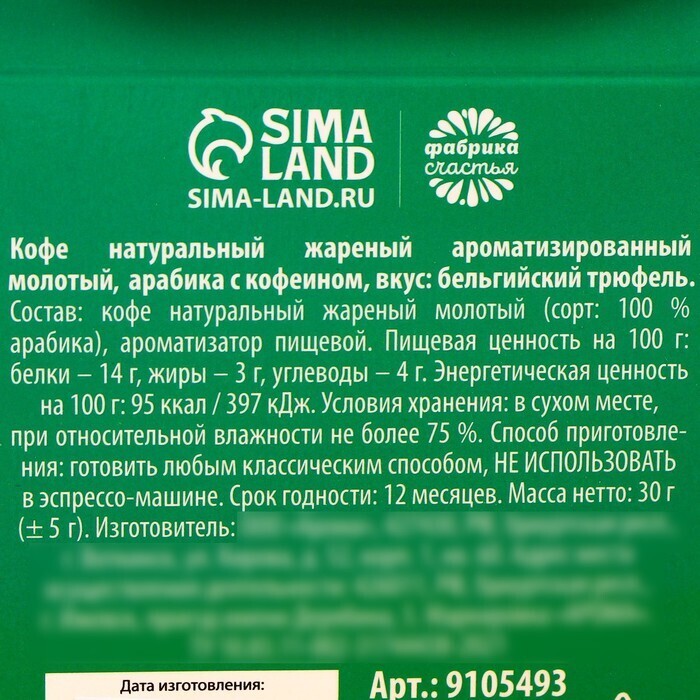 Состав: кофе натуральный жареный молотый (сорт: 100 % арабика), ароматизатор пищевой.