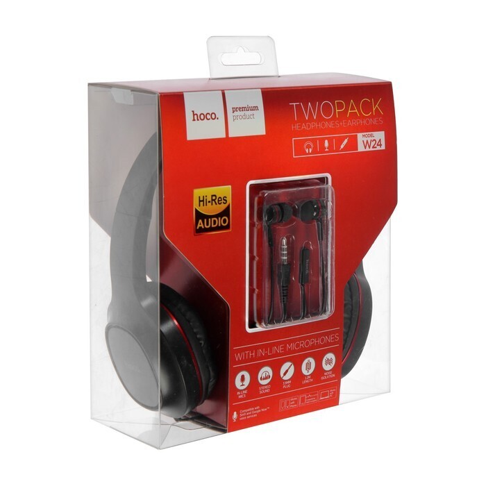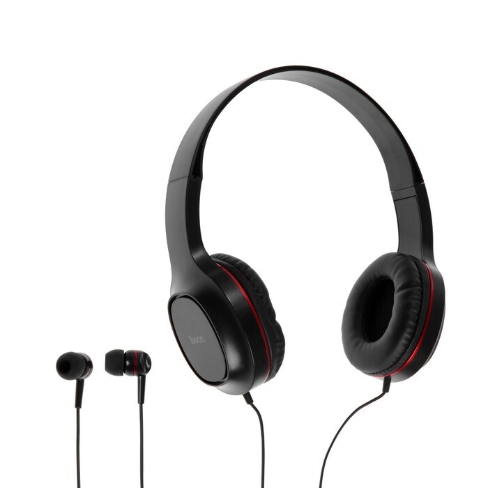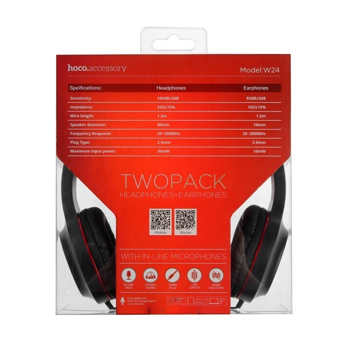 Комплект наушников Hoco W24, проводные, полноразмерные + вакуумные, проводные, красные