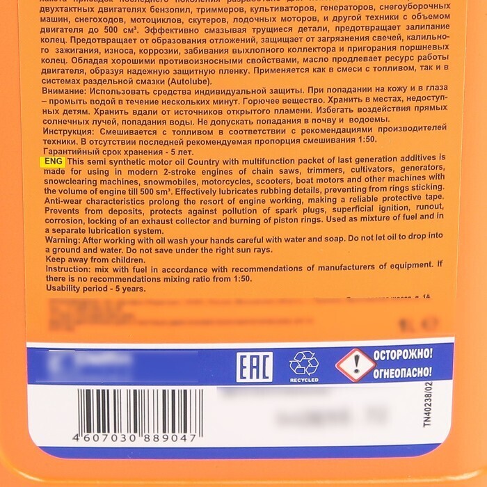 Масло двухтактное Country полусинтетическое API ТС, 1 л. Полусинтетическое моторное масло Country с добавлением многофункционального пакета присадок последнего поколения разработано для использования в современных двухтактных двигателях бензопил, триммеров, культиваторов, генераторов, снегоуборочных машин, снегоходов, мотоциклов, скутеров, лодочных моторов и другой техники с объемом двигателя до 500 см³. Эффективно смазывая трущиеся детали, предотвращает залипание колец. Противоизносные свойства продлевают ресурс работы двигателя, образуя надежную защитную пленку. Предотвращает от образования отложений, защищает от загрязнения свечей, поверхностного зажигания, износа, коррозии, забивания выхлопного коллектора и пригорания поршневых колец2704053)
