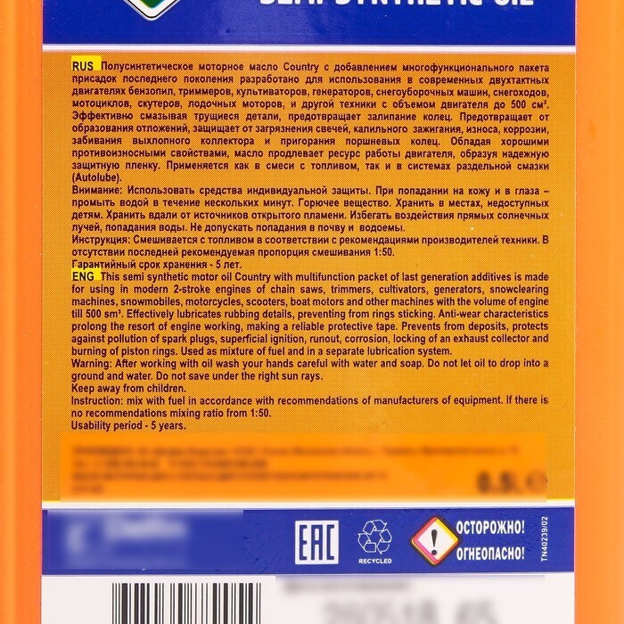Полусинтетическое моторное масло Country с добавлением многофункционального пакета присадок последнего поколения разработано для использования в современных двухтактных двигателях бензопил, триммеров, культиваторов, генераторов, снегоуборочных машин, снегоходов, мотоциклов, скутеров, лодочных моторов и другой техники с объемом двигателя до 500 см³. Эффективно смазывая трущиеся детали, предотвращает залипание колец. Противоизносные свойства продлевают ресурс работы двигателя, образуя надежную защитную пленку. Предотвращает от образования отложений, защищает от загрязнения свечей, поверхностного зажигания, износа, коррозии, забивания выхлопного коллектора и пригорания поршневых колец.