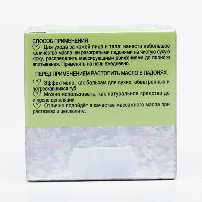 Для ухода за кожей лица и тела: нанести небольшое количество масла ши разогретыми ладонями на чистую сухую кожу, распределить массирующими движениями до полного впитывания. Применять на ночь ежедневно.