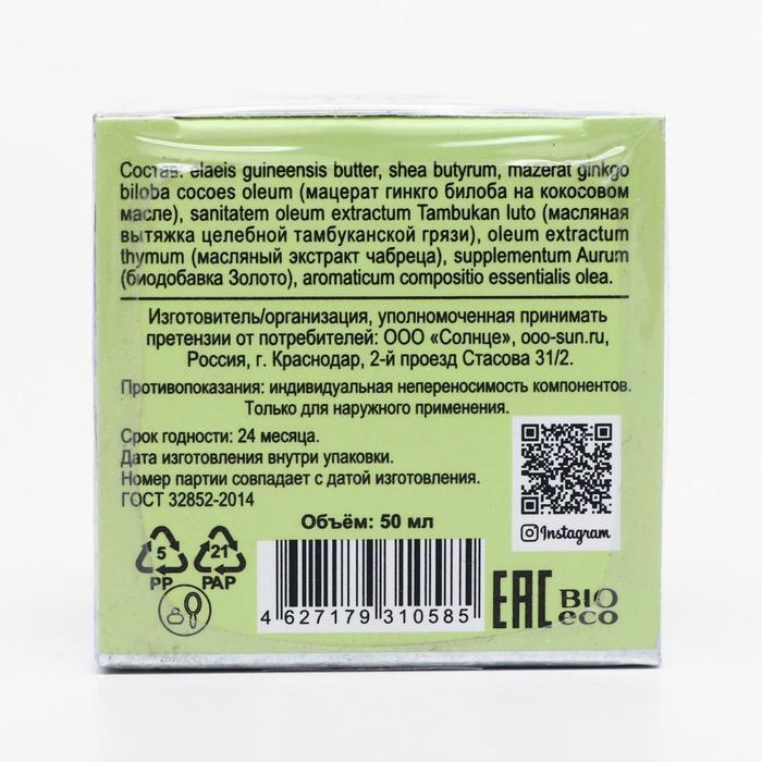 Состав: еlaeis guineensis butter, shea butyrum, mazerat ginkgo biloba cocoes oleum (мацерат гинкго билоба на кокосовом масле), sanitatem oleum extractum Tambukan luto (масляная вытяжка целебной тамбуканской грязи), oleum extractum thymum (масляный экстракт чабреца), supplementum Aurum (биодобавка Золото), aromaticum compositio essentialis olea.