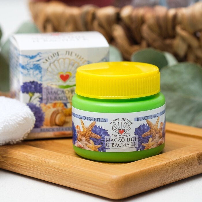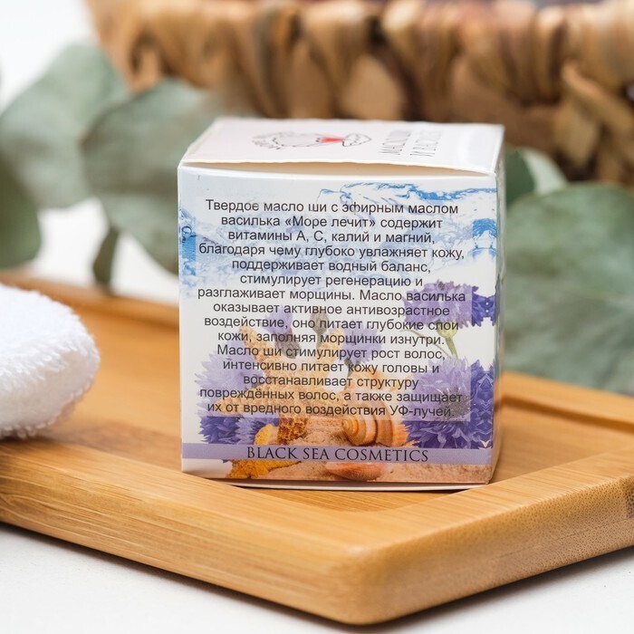 Твёрдое масло ши и василька Море Лечит содержит эфирные масла, витамины А, С, калий, кальций и магний. Благодаря чему глубоко увлажняет кожу, поддерживает водный баланс, стимулирует регенерацию клеток и выработку коллагена, препятствует преждевременному старению кожи и разглаживает морщины.