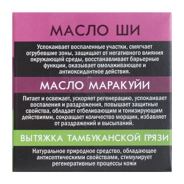 Состав: Масло дерева ши, масло маракуйи, вытяжка целебной грязи озера Тамбукан.