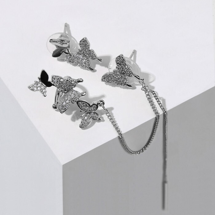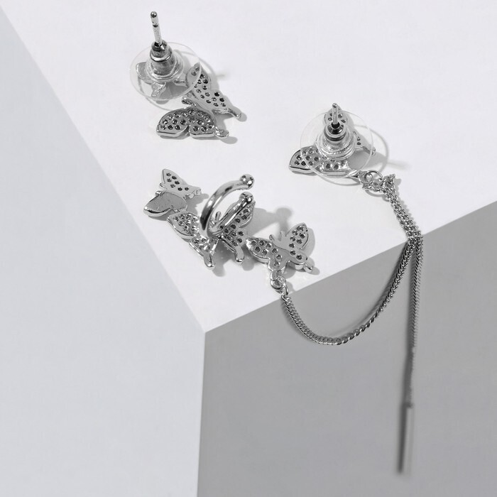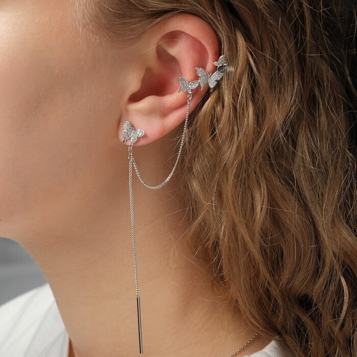 Набор серьги и каффа полёт бабочек, цвет белый в серебре