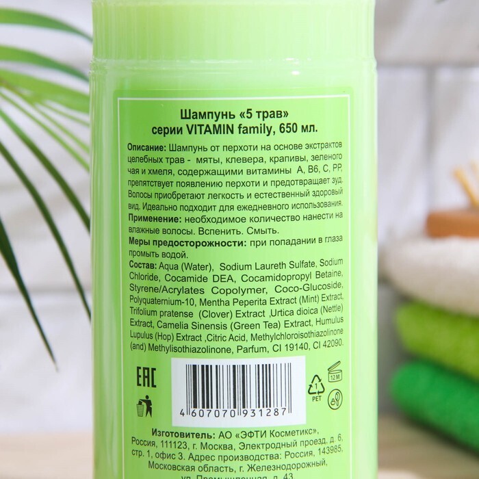 Шампунь от перхоти на основе 5 целебных трав - мяты, клевера, крапивы, зеленого чая и хмеля, препятствует появлению перхоти и предотвращает зуд.