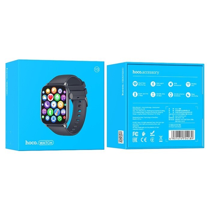 Смарт-часы Hoco Y3, 1.69", 240x285, IP68, BT5.0, 220 мАч, будильник, шагомер, черные