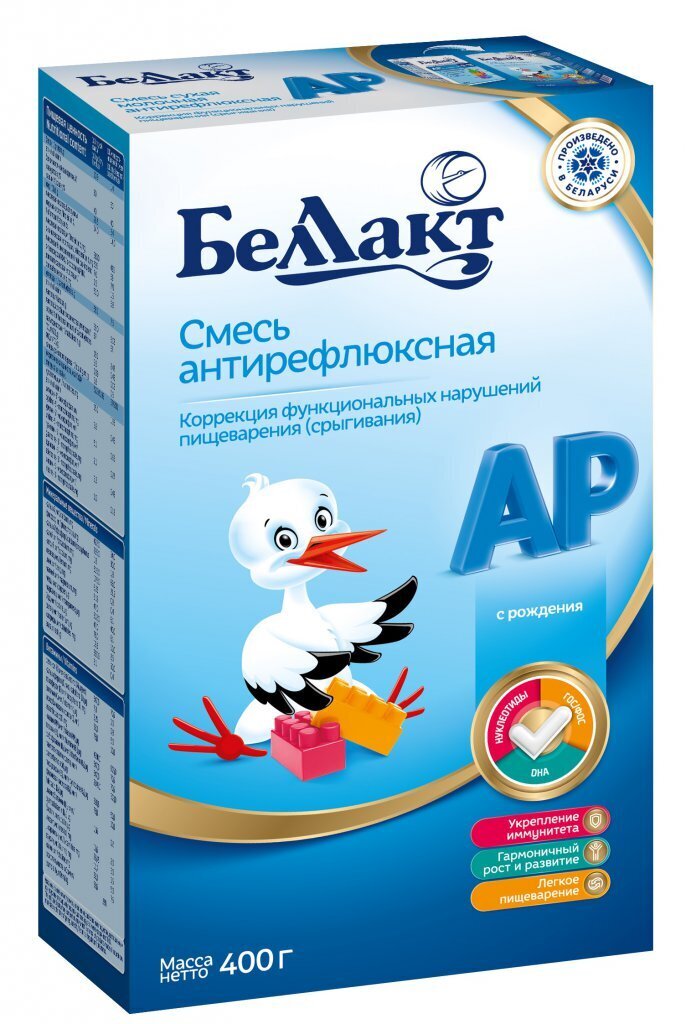 Антирефлюксное действие обеспечивает загуститель – камедь рожкового дерева, которая: увеличивает вязкость желудочного содержимого, чем способствует ликвидации срыгиваний; мягко стимулирует кишечную перистальтику, благодаря чему исчезают запоры и кишечные колики; содержит нуклеотиды, которые способствуют созреванию иммунной системы, стимулируют развитие мозга, улучшают регенерацию кишечного эпителия. По количеству и качеству белков, жиров, углеводов, минералов, микроэлементов, витаминов смесь аналогична базовой смеси «Беллакт 1+».