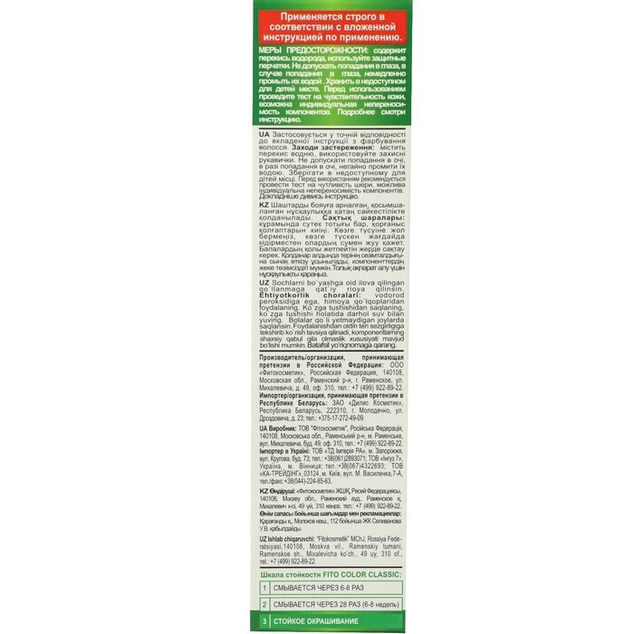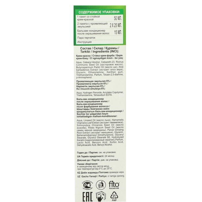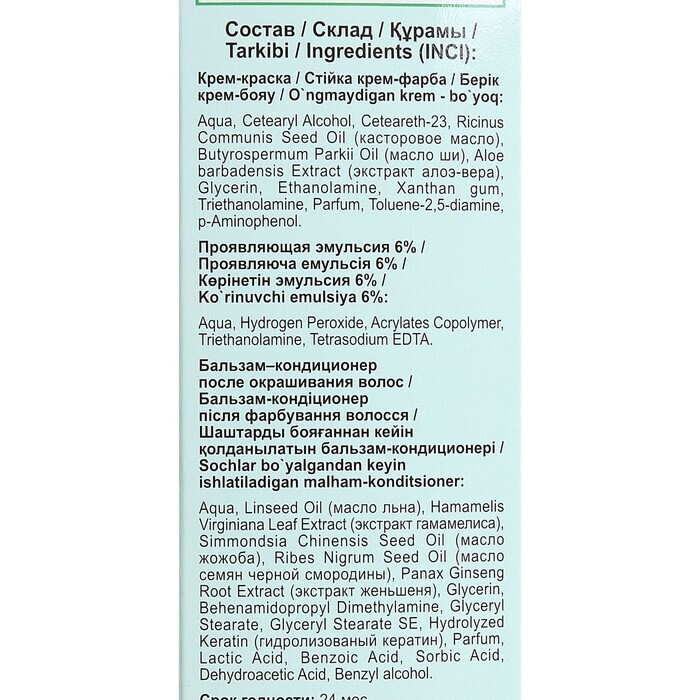 Крем-краска: Aqua, Cetearyl Alcohol, Ceteareth-23, Ricinus Communis Seed Oil (касторовое масло), Butyrospermum Parkii Oil (масло ши), Aloe barbadensis Extract (экстракт алоэ-вера), Glycerin, Ethanolamine, Xanthan gum, Triethanolamine, Parfum,Toluen-2,5-diamine, p- Aminophenol.