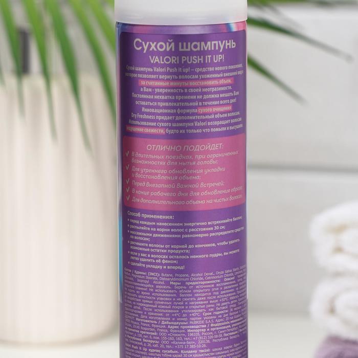 Сухой шампунь Valori Push it up – средство нового поколения, которое позволяет вернуть волосам ухоженный внешний вид и за считанные минуты восстановить объем. Инновационная формула сухого очищения придает дополнительный объем. Использование сухого шампуня Valori возвращает волосам ощущение свежести, будто их только что помыли и высушили.