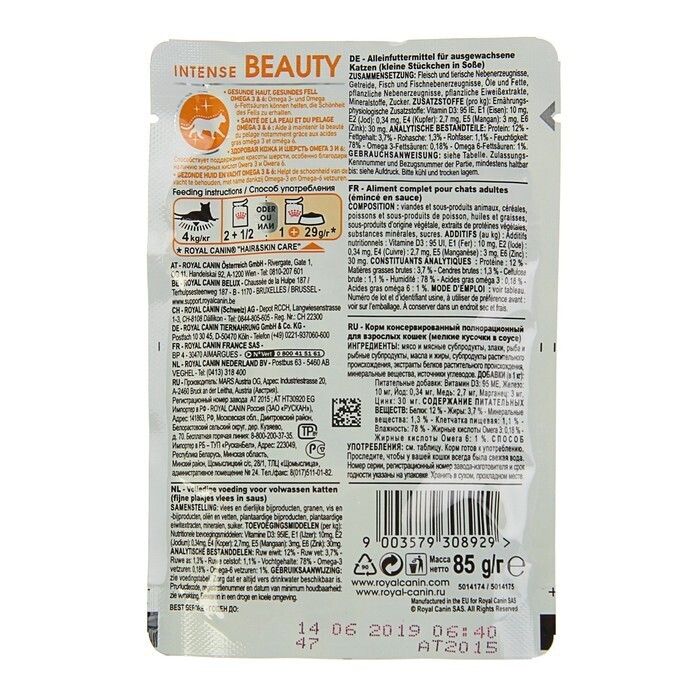 Влажный корм RC Intense Beauty для кошек, для кожи и шерсти, в соусе, пауч, 85 г