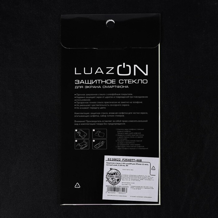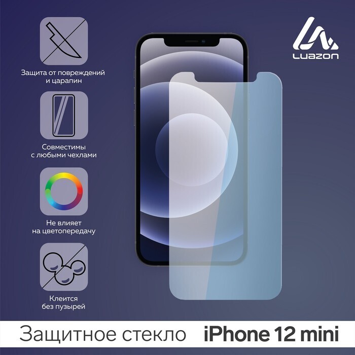 Защитное стекло 2.5D LuazON для iPhone 12 mini, полный клей, 0.26 мм, 9Н